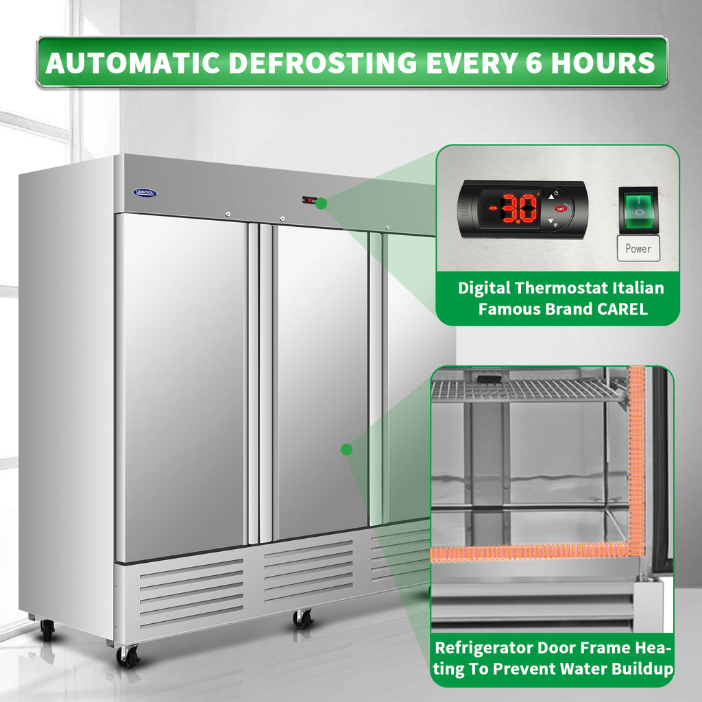 Maintains a consistent -10°F to 10°F range to keep frozen foods fresh and safe. 6-hour automatic defrost (4 times daily) prevents frost buildup without downtime. Heated door frame technology eliminates condensation and frost around the seal, ensuring optimal performance and meeting commercial food safety standards.